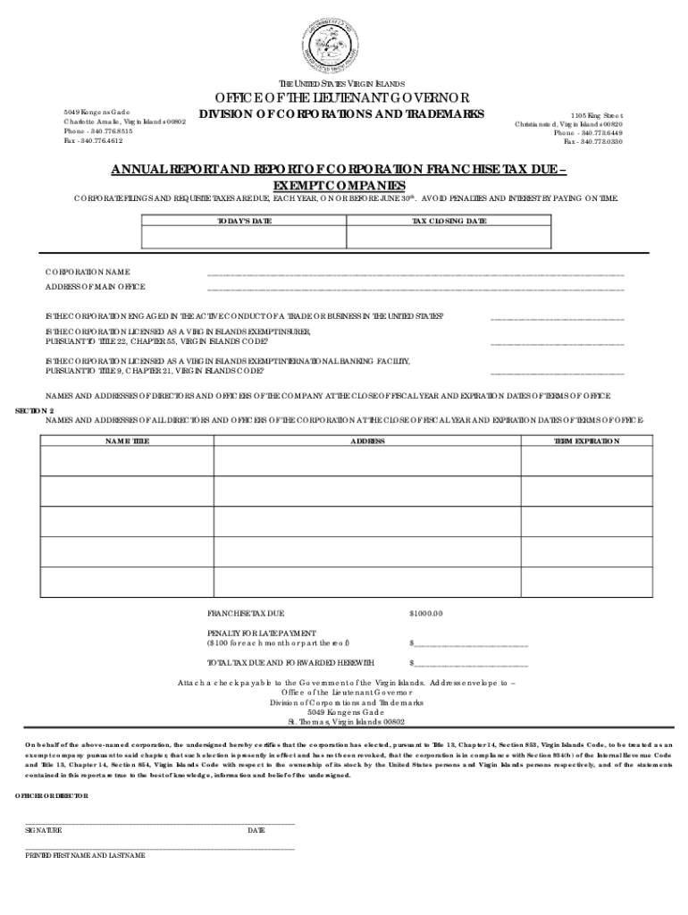 THE UNITED STATES VIRGIN ISLANDSOFFICE OF THE LIEUTENANT GOVERNOR5049 Kong ens Made Charlotte Amalia, Virgin Islands 00802 Phone 340.776.8515 Fax 340.776.4612DIVISION OF CORPORATIONS AND TRADEMARKS1105
