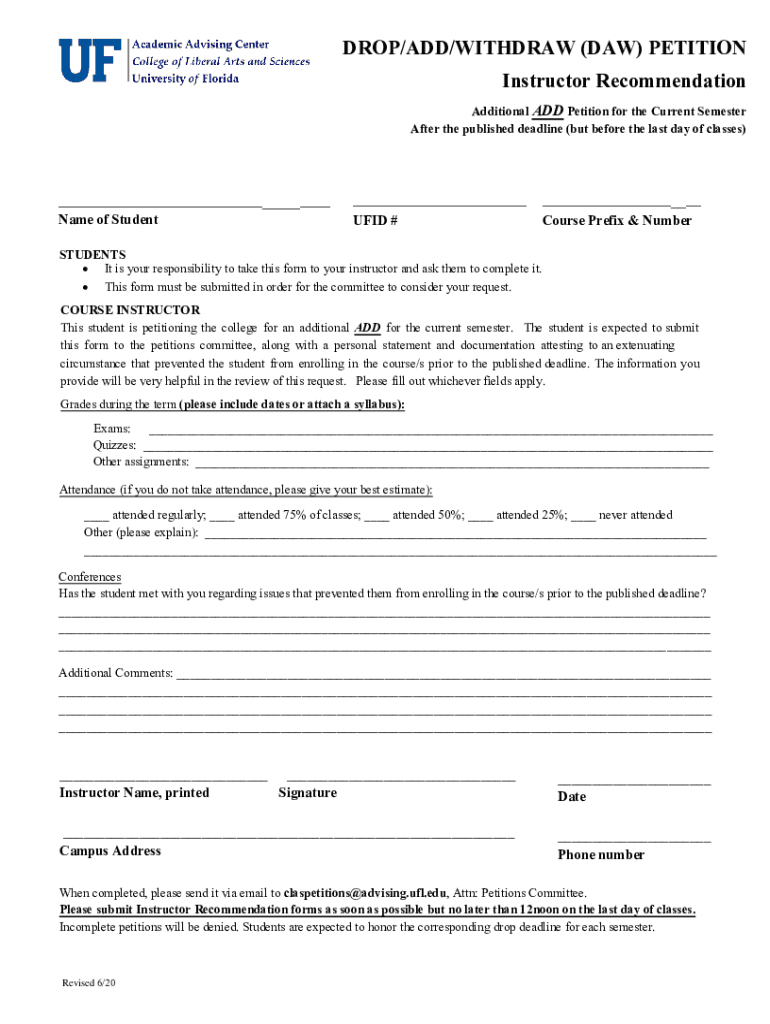 DROP/ADD/WITHDRAW (DAY) PETITION Instructor Recommendation Additional ADD Petition for the Current Semester After the published deadline (but before the last day of classes)_________Name of Studentship