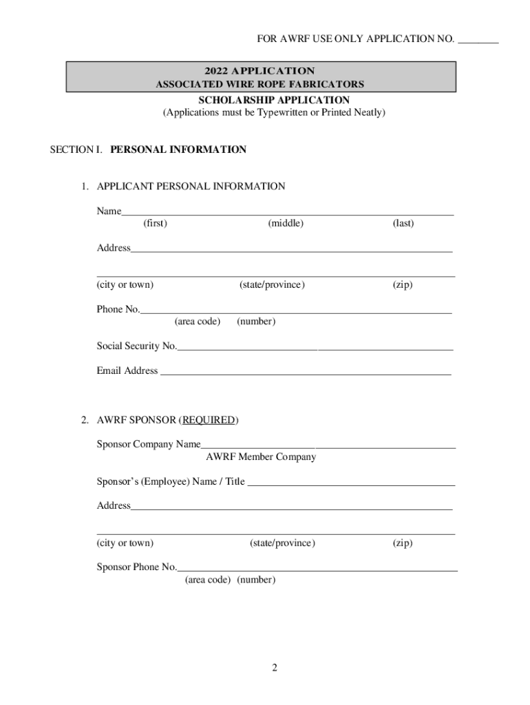 2022 APPLICATION ASSOCIATED WIRE ROPE FABRICATORS SCHOLARSHIP PROGRAM APPLICATION INSTRUCTIONS GENERAL: These instructions apply to the 2022 AWRY Scholarship Program application process. You will
