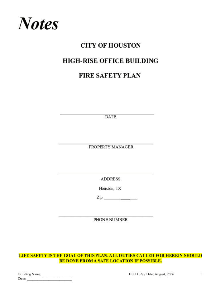 Notes CITY OF HOUSTON HIGH-RISE OFFICE BUILDING FIRE SAFETY PLANDATEPROPERTY MANAGERADDRESS Houston, TX Zip___PHONE NUMBERING SAFETY IS THE GOAL OF THIS PLAN. ALL DUTIES CALLED FOR HEREIN SHOULD BE