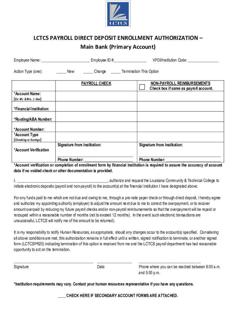 LCT CS PAYROLL DIRECT DEPOSIT ENROLLMENT AUTHORIZATION Main Bank (Primary Account) Employee Name: ___ Employee ID #___ Action Type (one):___ New___ Changed/Institution Code: ______ Termination This