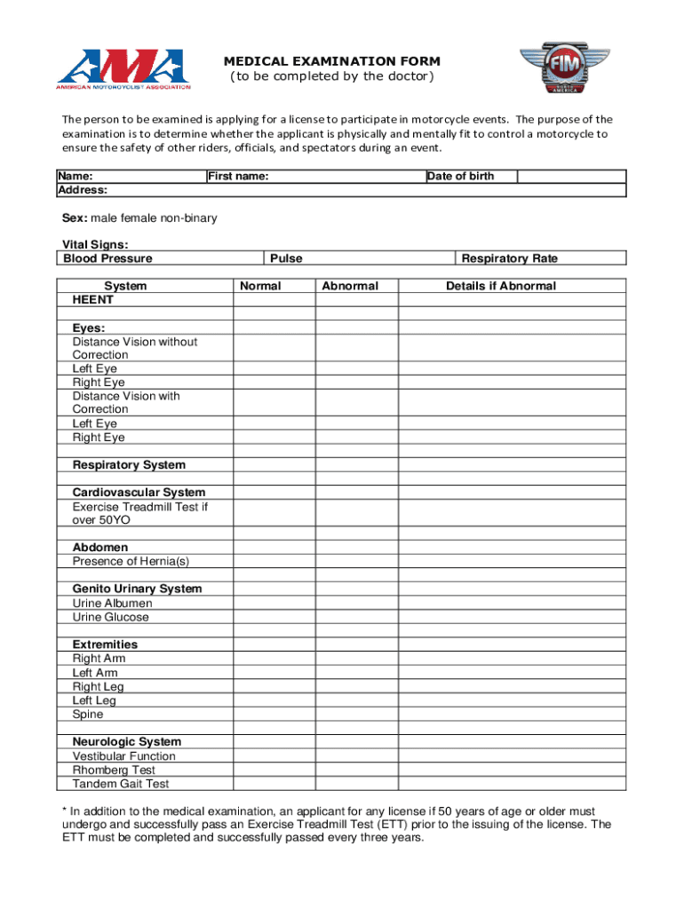 MEDICAL EXAMINATION FORM (to be completed by the doctor)The person to be examined is applying for a license to participate in motorcycle events. The purpose of the examination is to determine whether