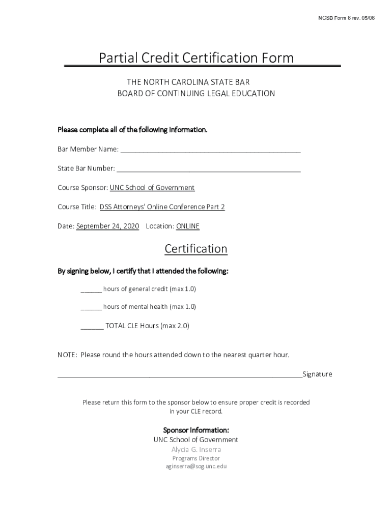 NTSB Form 6 rev. 05/06Partial Credit Certification Form THE NORTH CAROLINA STATE BAR BOARD OF CONTINUING LEGAL EDUCATIONPlease complete all the following information. Bar Member Name: ___ State Bar
