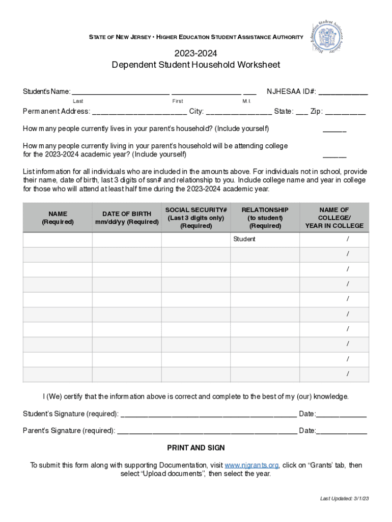 STATE OF NEW JERSEY HIGHER EDUCATION STUDENT ASSISTANCE AUTHORITY20232024 Dependent Student Household Worksheet Students Name:ESAA ID#: ___ LastFirstM. I. Permanent Address: ___ City: ___ State: ___