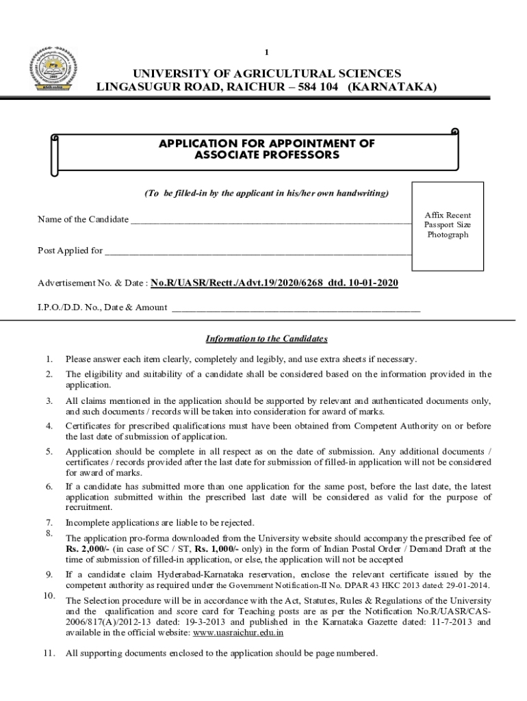 1UNIVERSITY OF AGRICULTURAL SCIENCES LINGASUGUR ROAD, RICHER 584 104 (KARNATAKA)APPLICATION FOR APPOINTMENT OF ASSOCIATE PROFESSORS (To be filled in by the applicant in his/her own handwriting) Name