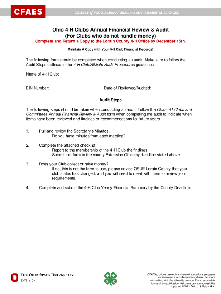 Ohio 4H Clubs Annual Financial Review & Audit (For Clubs who do not handle money) Complete and Return a Copy to the Lorain County 4H Office by December 15th. Maintain A Copy with Your 4H Club Financial