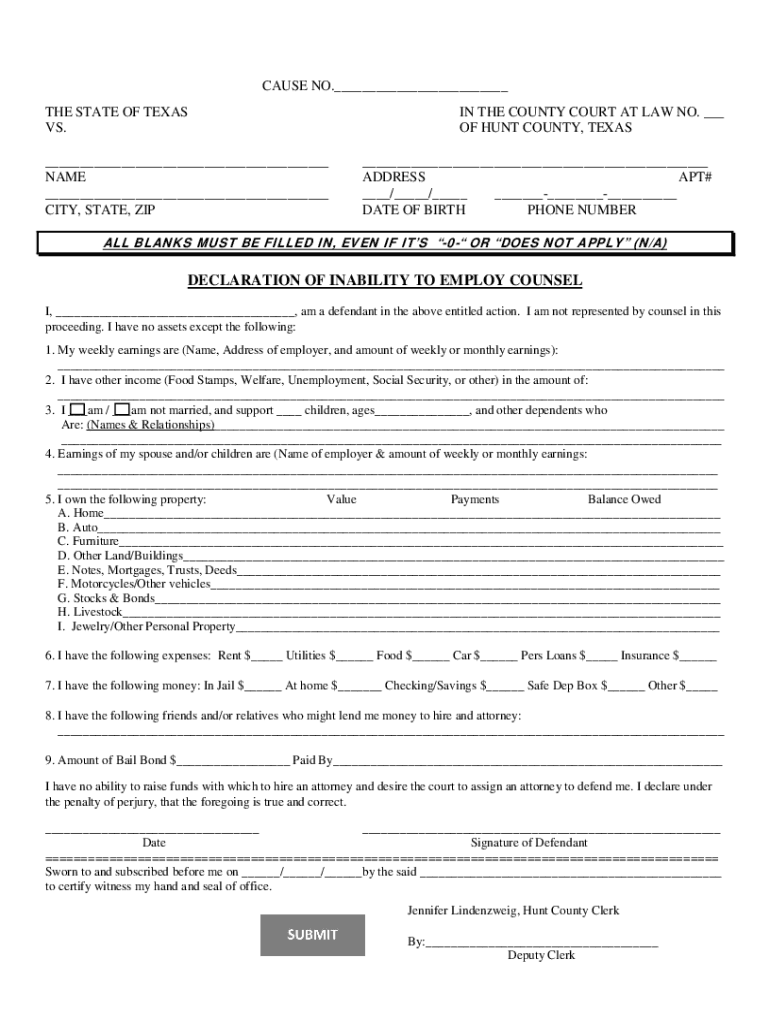 CAUSE NO.___ THE STATE OF TEXAS VS. ___ NAME ___ CITY, STATE, ZI Pins THE COUNTY COURT AT LAW NO. ___ OF HUNT COUNTY, TEXAS ___ ADDRESS APT# ___/___/___ _________ DATE OF BIRTH PHONE NUMBER ALL BLANKS