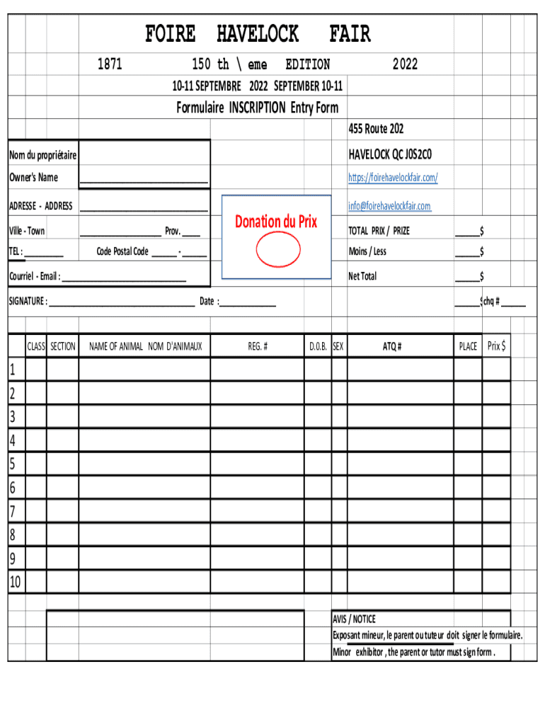 FIRE 1871HAVELOCK150 TH emeFAIREDITION20221011 SEPTEMBER 2022 SEPTEMBER 1011Formulaire INSCRIPTION Entry Form 455 Route 202 HAVELOCK QC J0S2C0Nom Du proprietary Owner\'s Name___ADRESSE ADDRESS___Ville