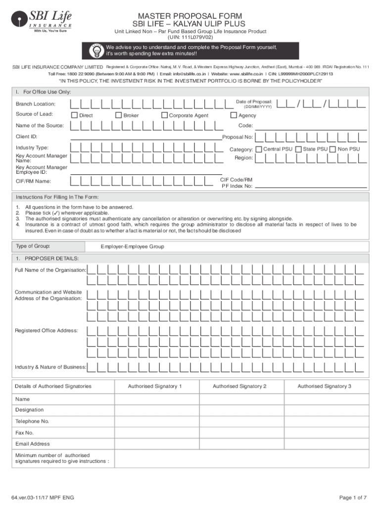 MASTER PROPOSAL FORM SBI LIFE KALYAN ULIP PLUS Unit Linked Sonar Fund Based Group Life Insurance Product (IN: 111L079V02)We advise you to understand and complete the Proposal Form yourself, it's worth