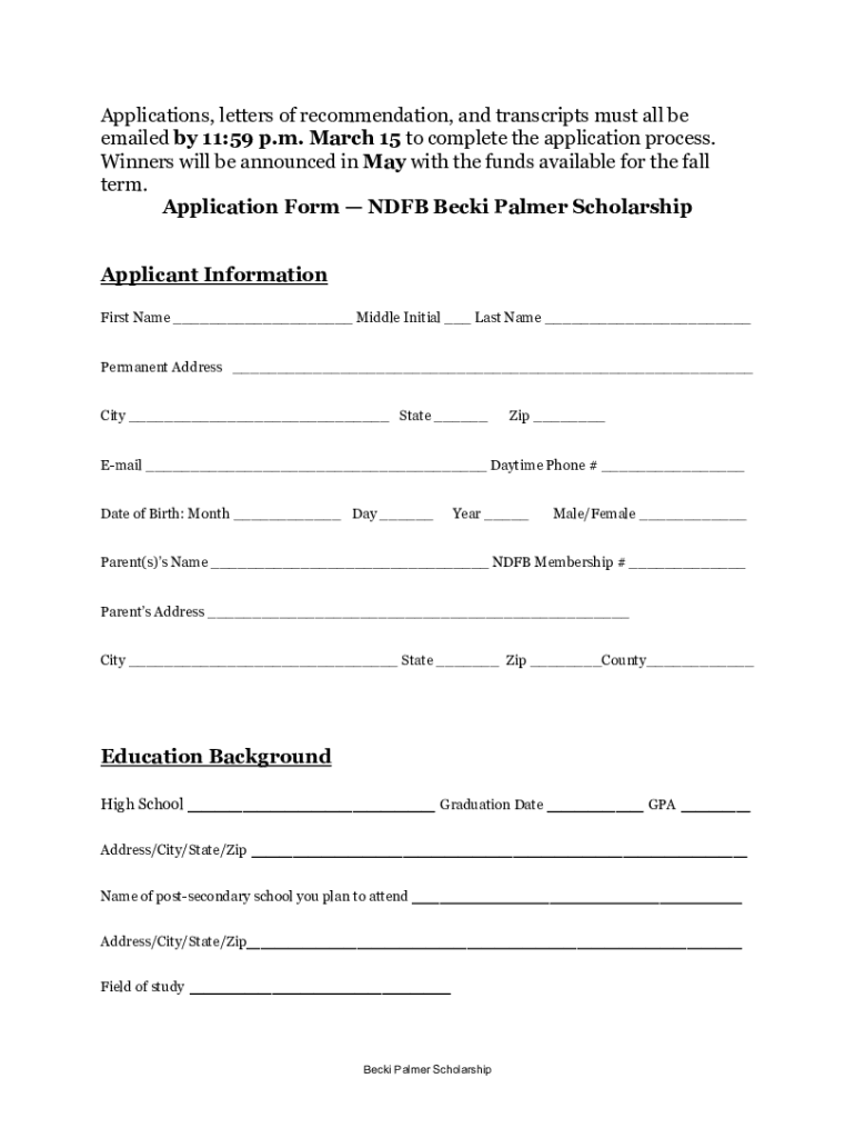 NDB Becky Palmer Scholarship (For high school seniors) Purpose:The Scholarship will recognize academic achievements as well as leadership skills of high school seniors. Becky Palmer was an employee