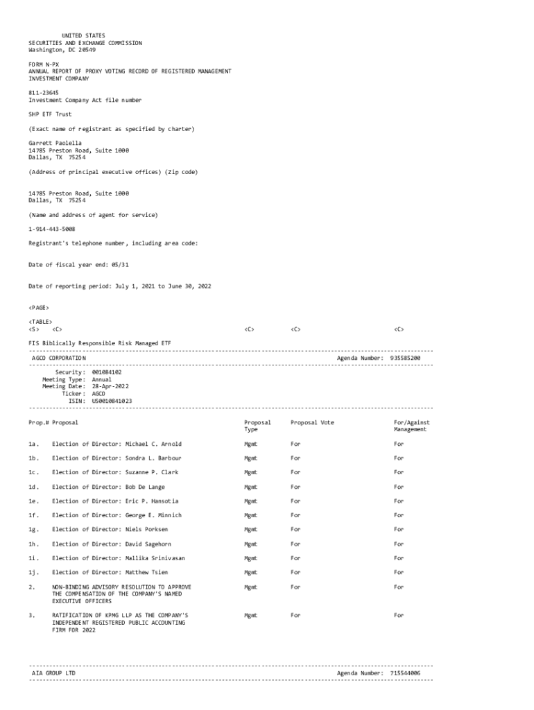 UNITED STATESSECURITIES AND EXCHANGE COMMISSION Washington, DC 20549FORM ANNUAL REPORT OF PROXY VOTING RECORD OF REGISTERED MANAGEMENTINVESTMENT COMPANY81123645Investment Company Act file number SHP