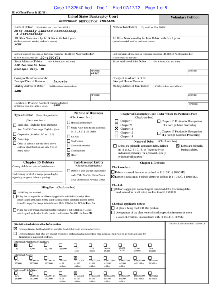 Case 1232540hcdDoc 1Filed 07/17/12Page 1 of 8B1 (Official Form 1) (12/11)United States Bankruptcy Court NORTHERN DISTRICT OF INDIANA Name of DebtorVoluntary Petitionary of Joint Debtor(if individual,