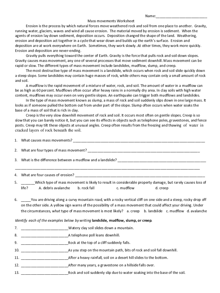 Name:___ Mass movements Worksheet Erosion is the process by which natural forces move weathered rock and soil from one place to another. Gravity, running water, glaciers, waves and wind all cause