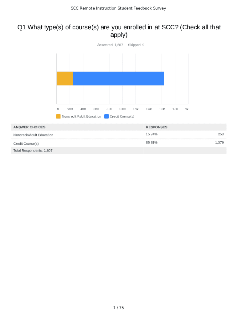 SCC Remote Instruction Student Feedback SurveyQ1 What type(s) of course(s) are you enrolled in at SCC? (Check all that apply) Answered: 1,6070200400600Noncredit/Adult Education8001000Skipped: 91.2k1.4k1.6k1.8k2kCredit
