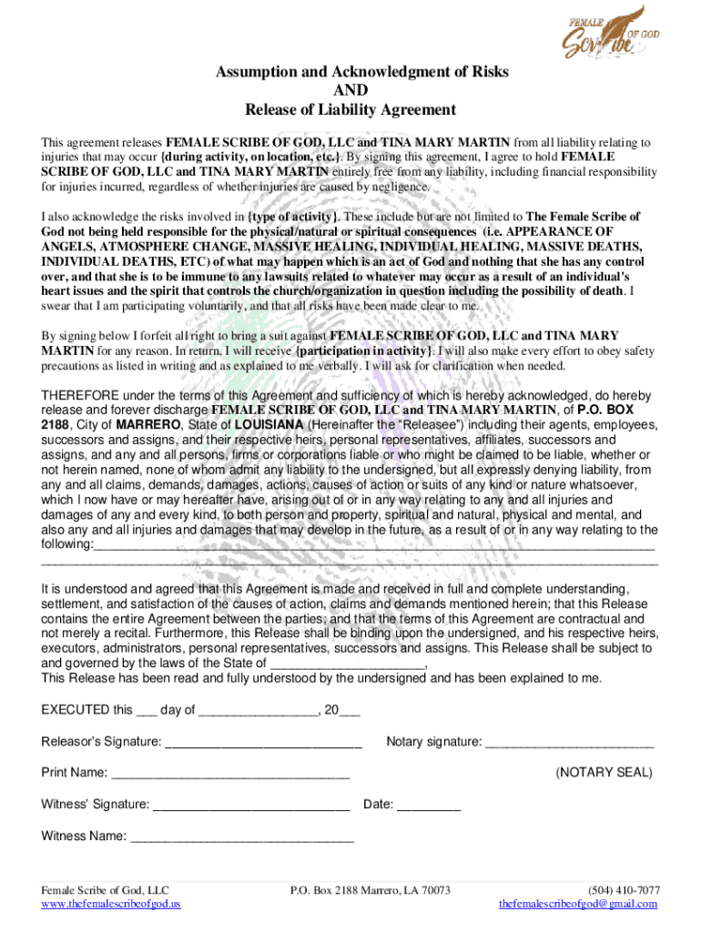 Assumption and Acknowledgment of Risks AND Release of Liability Agreement This agreement releases FEMALE SCRIBE OF GOD, LLC and TINA MARY MARTIN from all liability relating to injuries that may occur