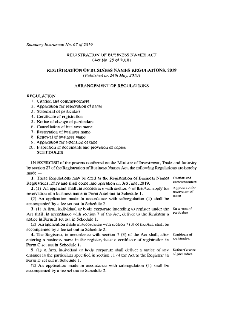 Statutory Instrument No. 67 o f 2019 REGISTRATION OF BUSINESS NAMES ACT (Act No. 25 o f 2018)REGISTRATION OF BUSINESS NAMES REGULATIONS, 2019 (Published on 24th May 2019) ARRANGED ENT OF REGULATIONS