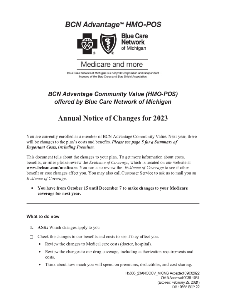 BCN Advantage Community Value (HMO POS) offered by Blue Care Network of MichiganAnnual Notice of Changes for 2023 You are currently enrolled as a member of BCN Advantage Community Value. Next year,