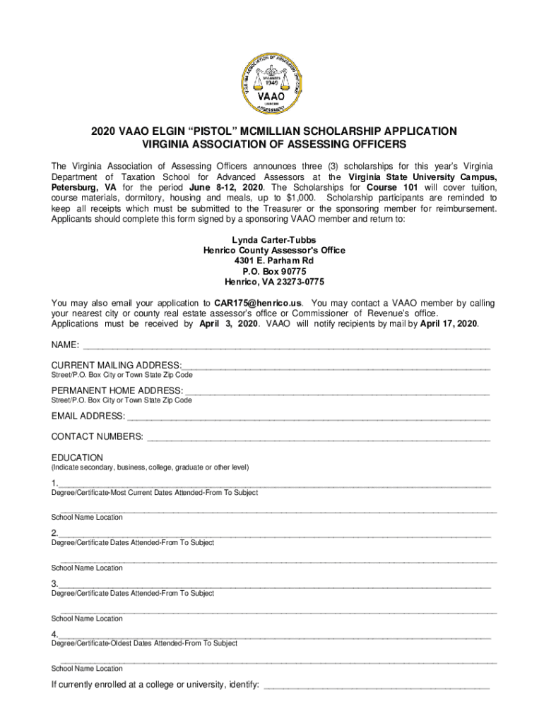 2020 AAO ELGIN PISTOL McMillan SCHOLARSHIPS AVAILABLE CAREERS IN PROPERTY ASSESSMENT AND APPRAISAL Assessment involves the discovery, listing, and appraising of property for ad valor em taxation purposes.
