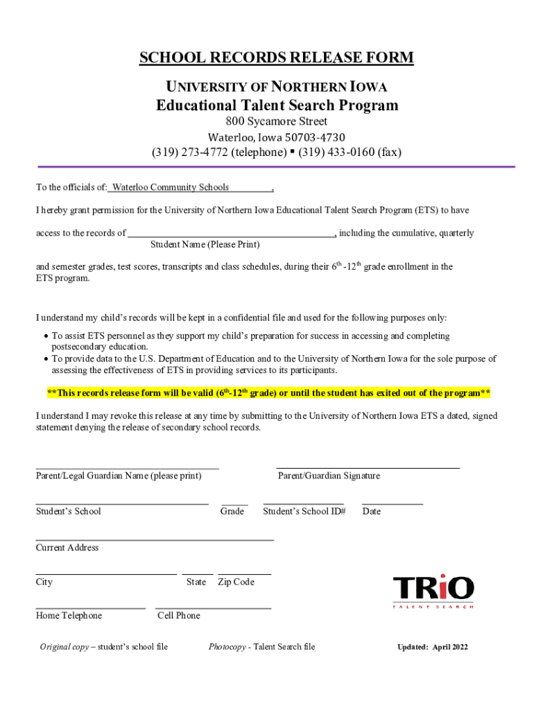 SCHOOL RECORDS RELEASE FORM UNIVERSITY OF NORTHERN IOWA Educational Talent Search Program 800 Sycamore Street Waterloo, Iowa 507034730(319) 2734772 (telephone) (319) 4330160 (fax) To the officials