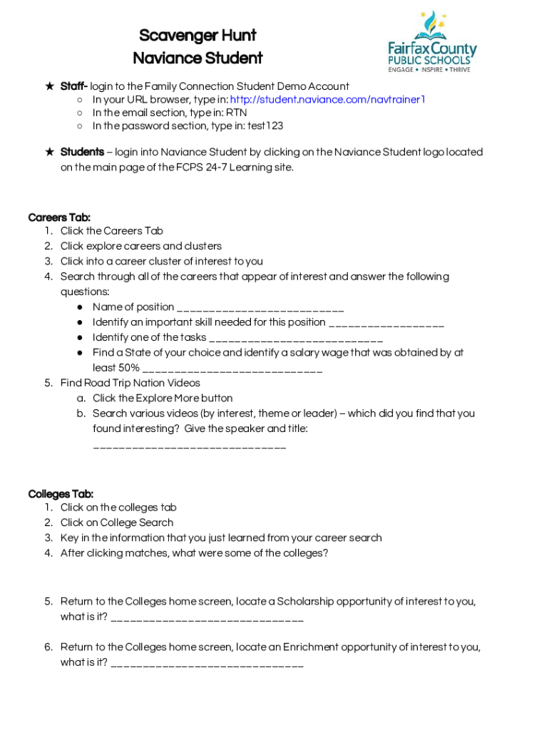 Scavenger Hunt Variance Student Staff login to the Family Connection Student Demo Account In your URL browser, type in: http://student.naviance.com/navtrainer1 In the email section, type in: RTN In