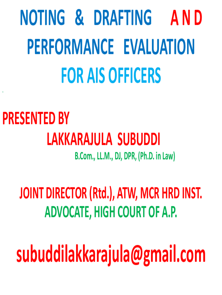 NOTING & DRAFTING A N D PERFORMANCE EVALUATION FOR AIS OFFICERS PRESENTED BY LAKKARAJULA SUBURB B.Com., LL.M., DJ, DR, (Ph.D. in Law)JOINT DIRECTOR (RTD.), ATW, MCR HRD INST. ADVOCATE, HIGH COURT