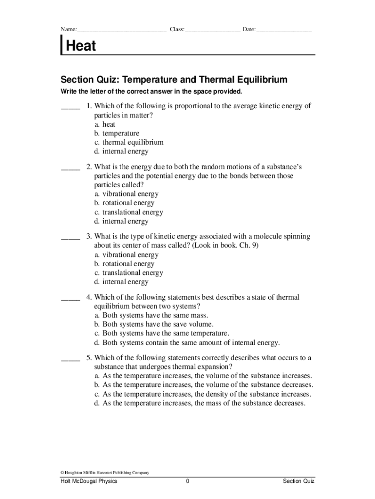 Name: ___ Class: ___ Date: ___Heat Section Quiz: Temperature and Thermal Equilibrium Write the letter of the correct answer in the space provided.___ 1. Which of the following is proportional to the