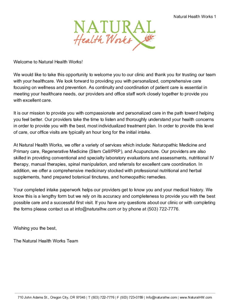 Natural Health Works 1Welcome to Natural Health Works! We would like to take this opportunity to welcome you to our clinic, and thank you for trusting our team with your healthcare. We look forward