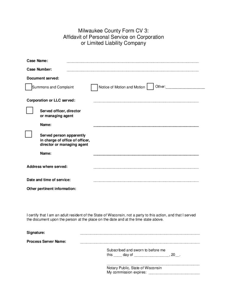 Milwaukee County Form CV 3: Affidavit of Personal Service on Corporation or Limited Liability Company Case Name:___Case Number:___Document served: Other:___ Summons and Complaint Notice of Motion