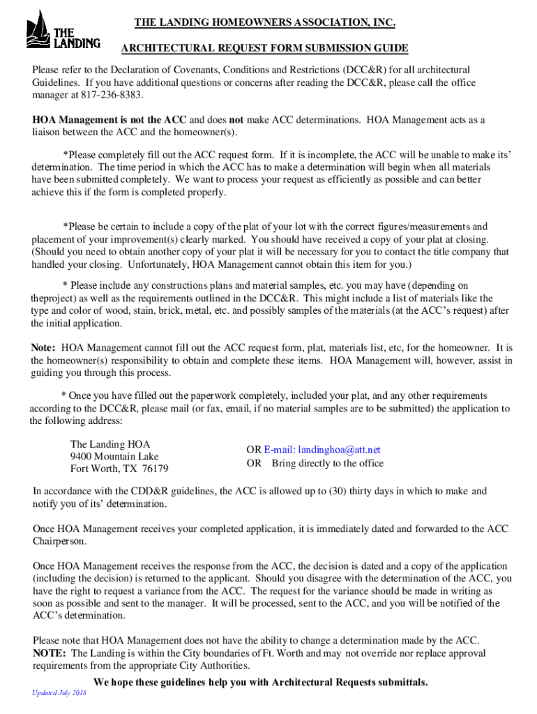THE LANDING HOMEOWNERS ASSOCIATION, INC. ARCHITECTURAL REQUEST FORM SUBMISSION GUIDE Please refer to the Declaration of Covenants, Conditions and Restrictions (CC&R) for all architectural Guidelines.