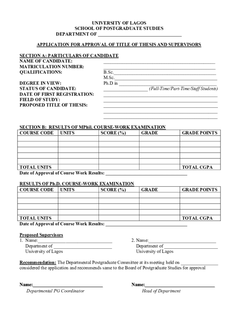 UNIVERSITY OF LAGOS SCHOOL OF POSTGRADUATE STUDIES DEPARTMENT OF ___ APPLICATION FOR APPROVAL OF TITLE OF THESIS AND SUPERVISORS SECTION A: PARTICULARS OF CANDIDATE NAME OF CANDIDATE: ___ MATRICULATION