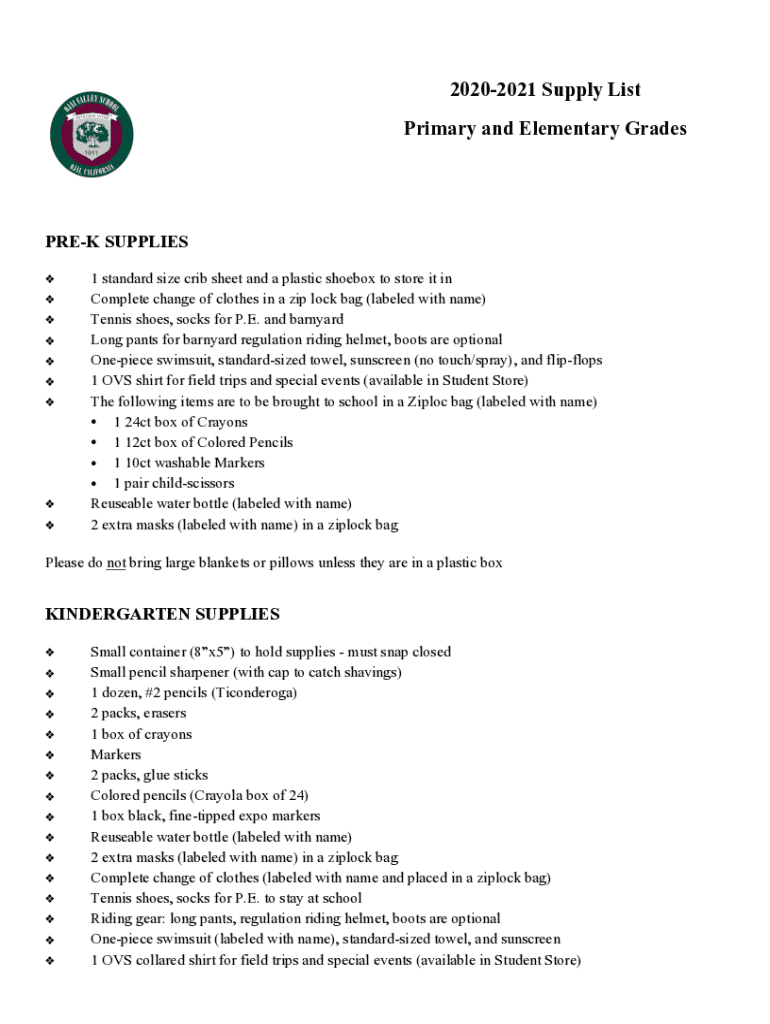 20202021 Supply List Primaries and Elementary GradesPREK SUPPLIES 1 standard size crib sheet and a plastic shoebox to store it in Complete change of clothes in a zip lock bag (labeled with name) Tennis