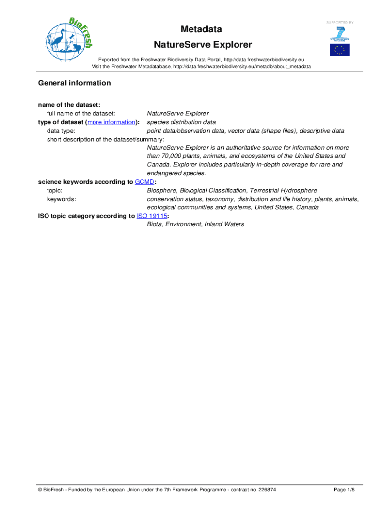 Metadata NatureServe Explorer Exported from the Freshwater Biodiversity Data Portal, http://data.freshwaterbiodiversity.eu Visit the Freshwater Meta database, http://data.freshwaterbiodiversity.eu/metadb/about_metadataGeneral