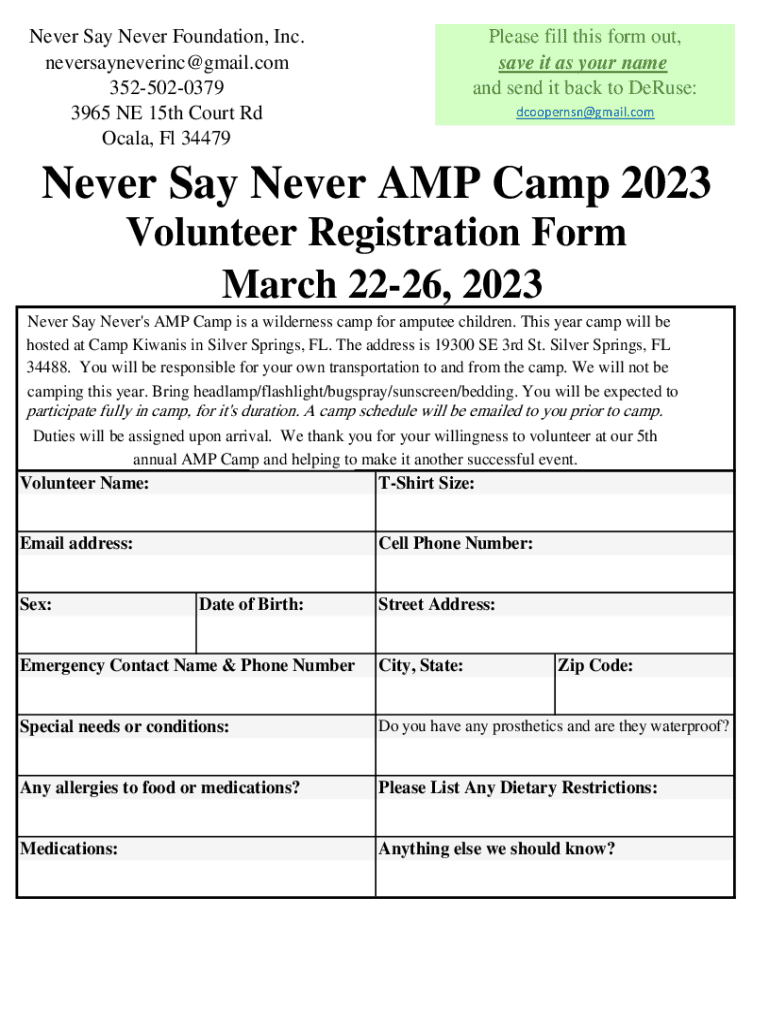 Never Say Never Foundation, Inc. neversayneverinc@gmail.com 3525020379 3965 NE 15th Court Rd Ocala, Fl 34479Please fill this form out, save it as your name and send it back to Defuse: dcoopernsn@gmail.comNever