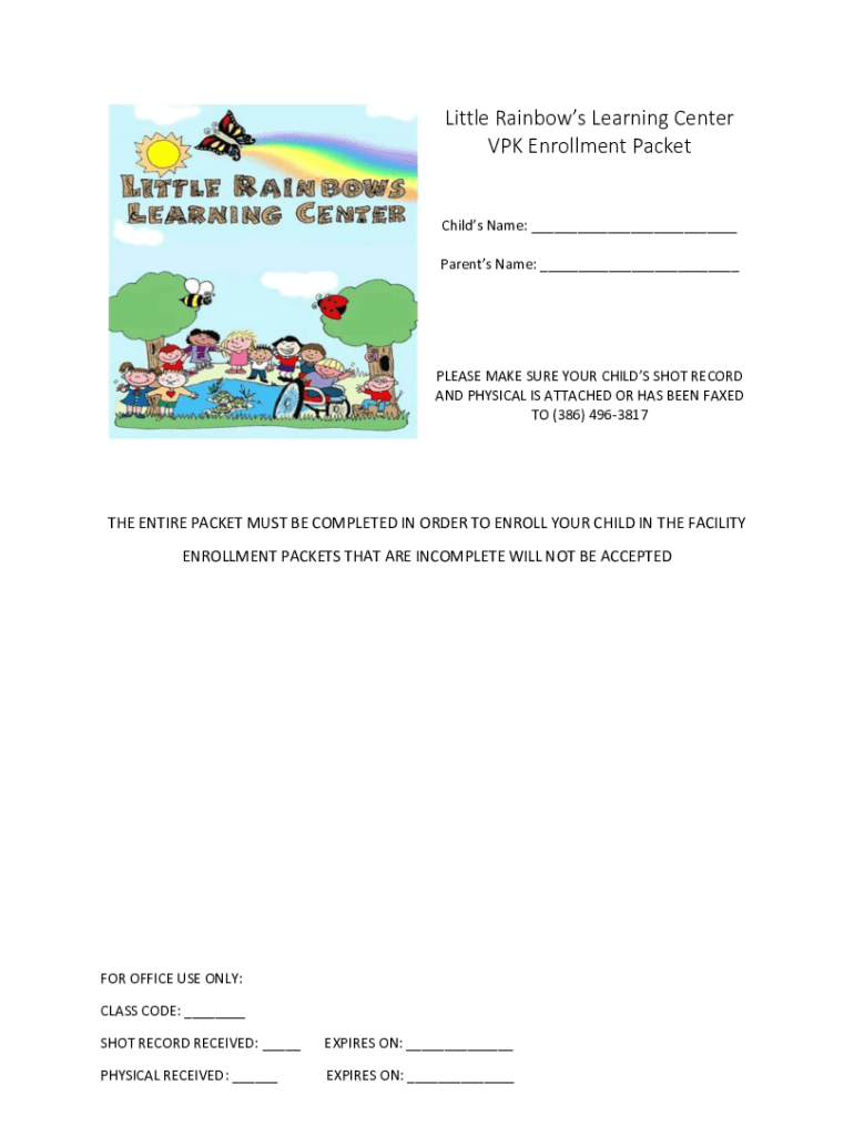 Little Rainbows Learning Center VP Enrollment PacketChilds Name: ___ Parents Name: ___PLEASE MAKE SURE YOUR CHILD SHOT RECORD AND PHYSICAL IS ATTACHED OR HAS BEEN FAXED TO (386) 4963817THE ENTIRE