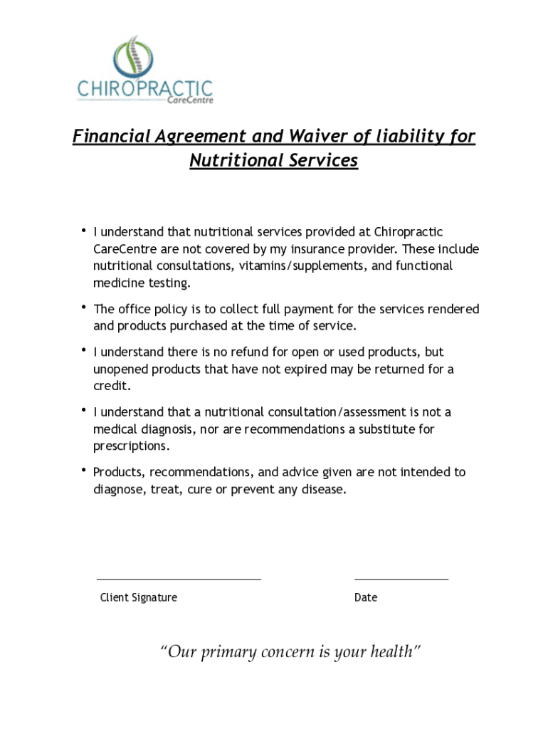 Financial Agreement and Waiver of liability for Nutritional Services I understand that nutritional services provided at Chiropractic Carpenter are not covered by my insurance provider. These include