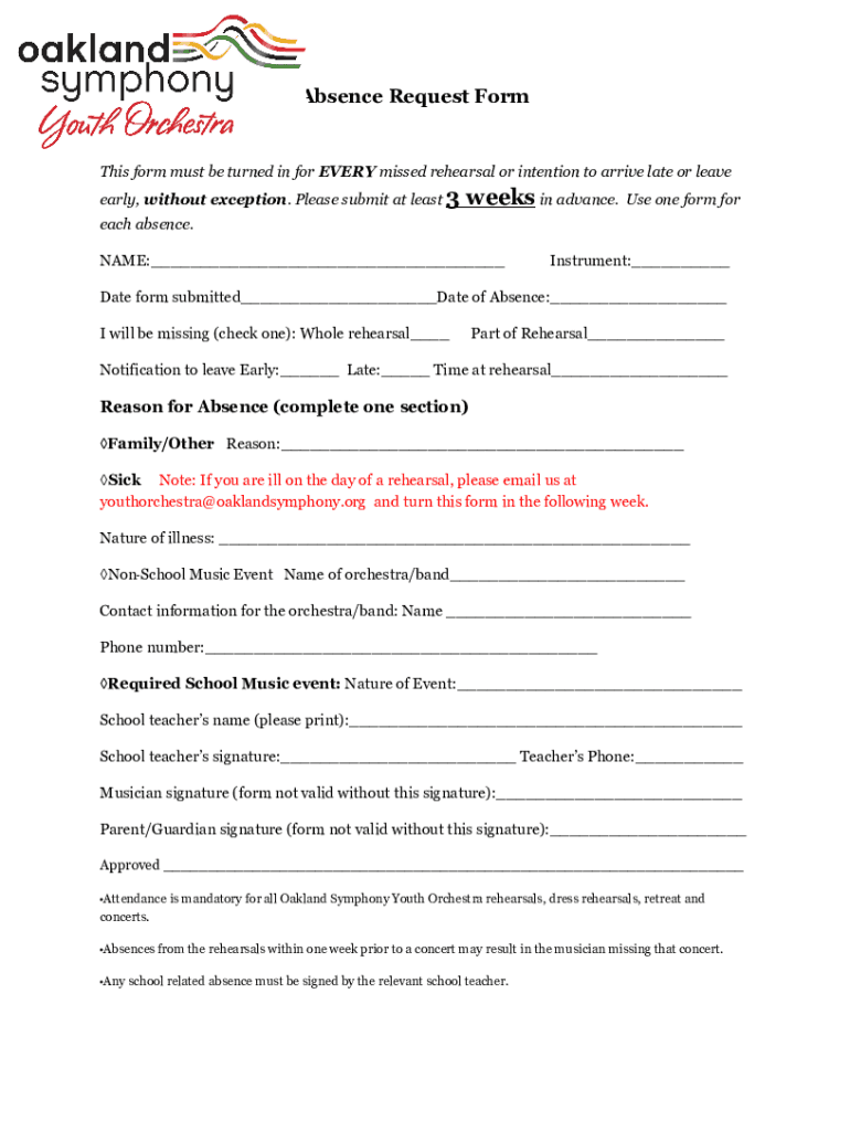 Absence Request Forms form must be turned in for EVERY missed rehearsal or intention to arrive late or leave early, without exception. Please submit at least 3weeks in advance. Use one form for each