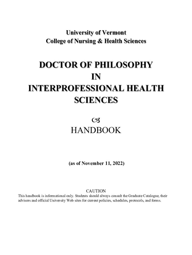 University of Vermont College of Nursing & Health SciencesDOCTOR OF PHILOSOPHY IN INTERPROFESSIONAL HEALTH SCIENCES HANDBOOK(as of November 11, 2022)Cautions handbook is informational only. Students