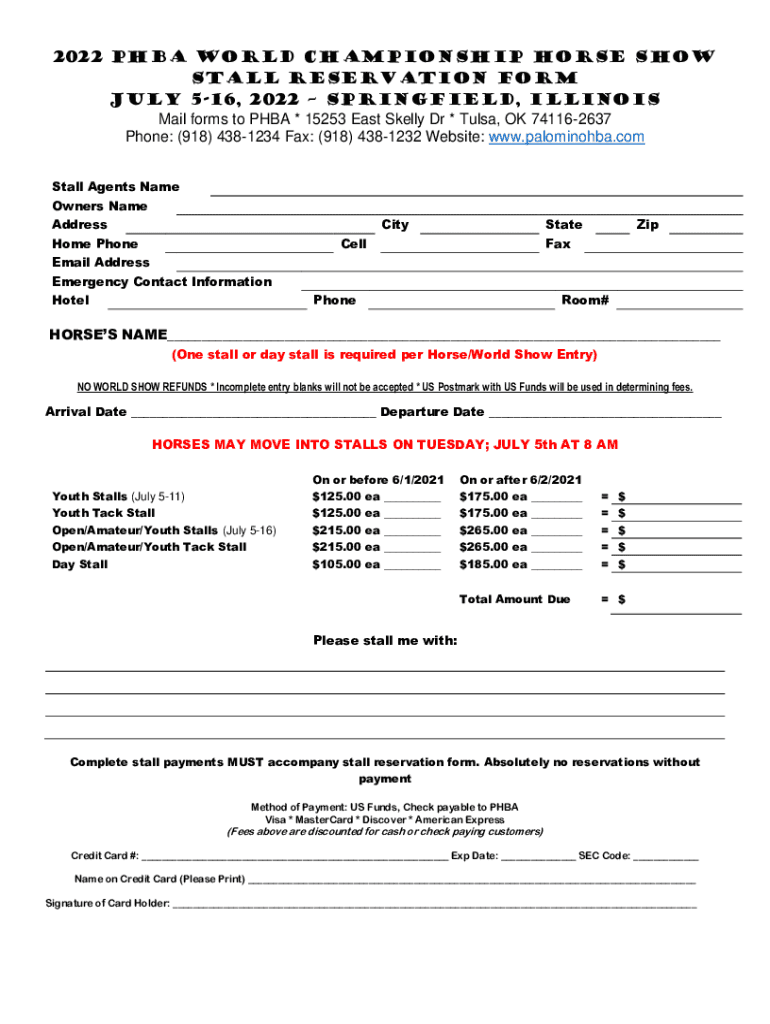 2022 PBA WORLD CHAMPIONSHIP HORSE SHOW Stall reservation form JULY 516, 2022 SPRINGFIELD, ILLINOIS Mail forms to PBA * 15253 East Kelly Dr * Tulsa, OK 741162637 Phone: (918) 4381234 Fax: (918) 4381232