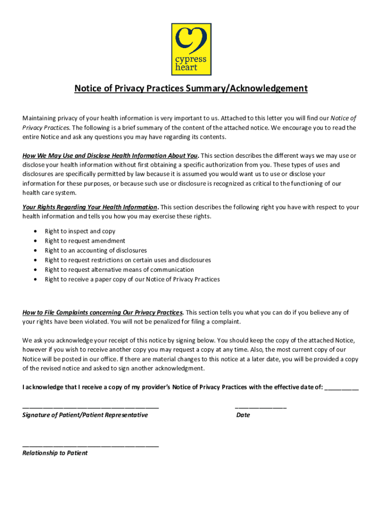 Get the free Notice of Privacy Practices Summary/Acknowledgement