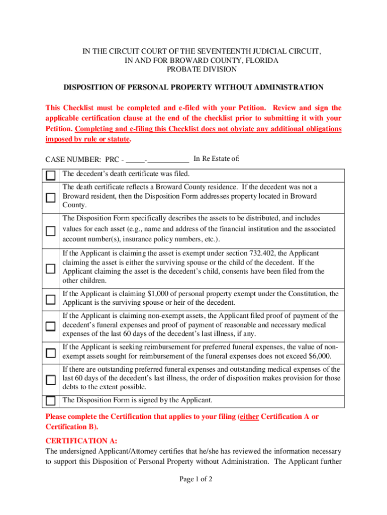 IN THE CIRCUIT COURT OF THE SEVENTEENTH JUDICIAL CIRCUIT, IN AND FOR BROWARD COUNTY, FLORIDA PROBATE DIVISION DISPOSITION OF PERSONAL PROPERTY WITHOUT ADMINISTRATION This Checklist must be completed