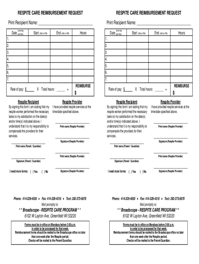 Obtain the respite care reimbursement request form from your healthcare provider or insurance company.