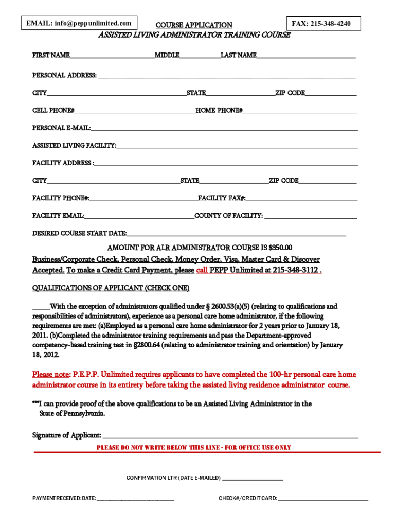 EMAIL: info@peppunlimited.comFAX: 2153484240COURSE APPLICATIONASSISTED LIVING ADMINISTRATOR TRAINING COURSE FIRST NAMEMIDDLELAST IMPERSONAL ADDRESS: CITYSTATECELL PHONE#ZIP WODEHOUSE PHONE#PERSONAL