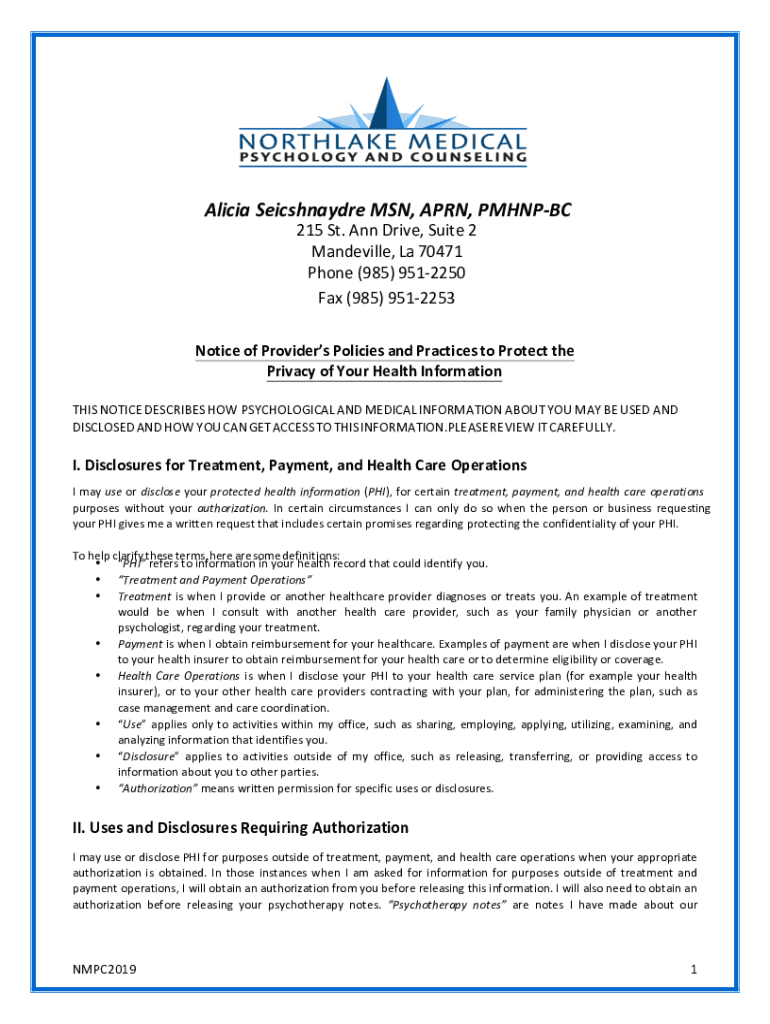 Alicia Seicshnaydre MSN, APRN, PMHNPBC215 St. Ann Drive, Suite 2 Mandeville, La 70471 Phone (985) 9512250 Fax (985) 9512253Notice of Providers Policies and Practices protecting privacy of Your Health