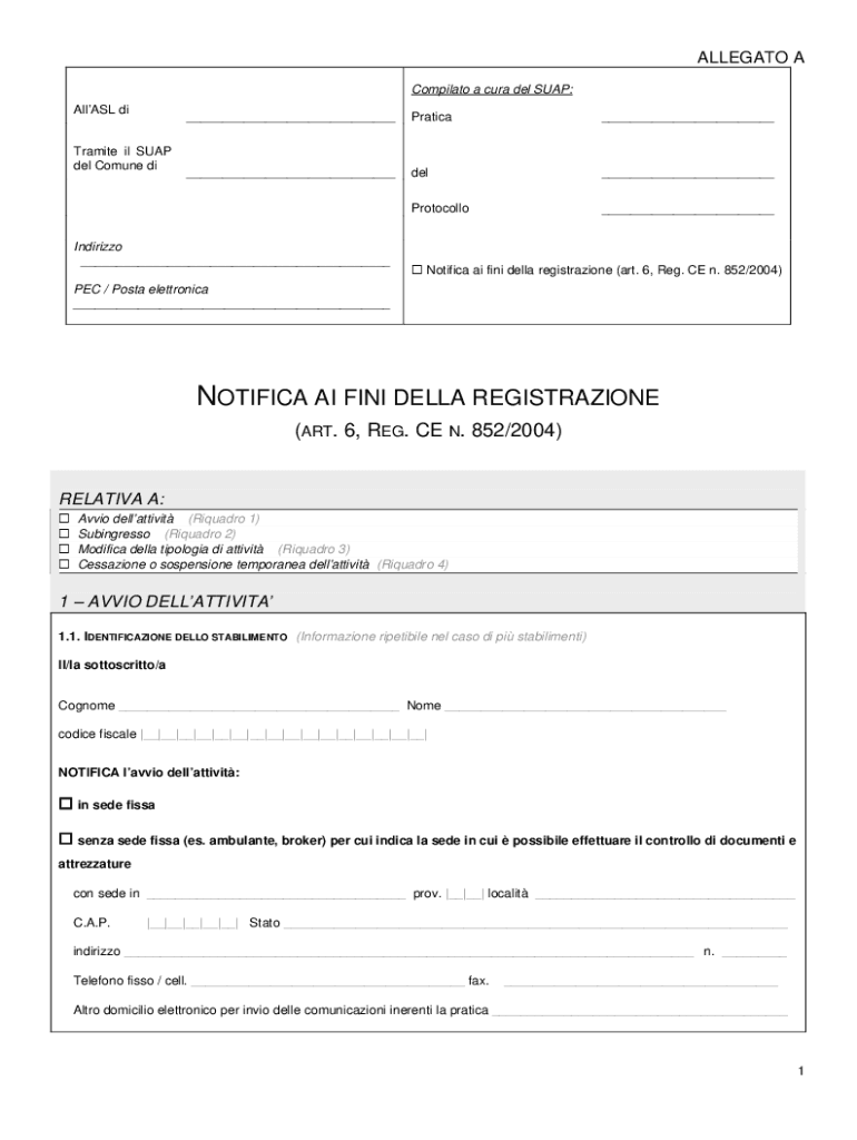 ALLEGATION A Compilation a Cuba Del SOAP: All ASL dynamite IL SOAP del Commune di___Pratica______del___Protocollo___Indirizzo ___ Notified AI fine Della registration (art. 6, Reg. CE n. 852/2004)PEC