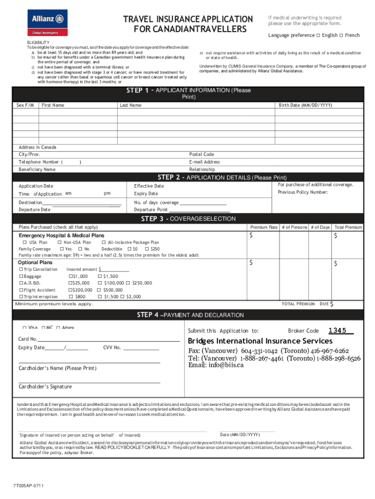 TRAVEL INSURANCE APPLICATION FOR CANADIANTRAVELLERS ELIGIBILITY To be eligible for coverage you must, as of the date you apply for coverage and the effective date: a) be at least 15 days old and no