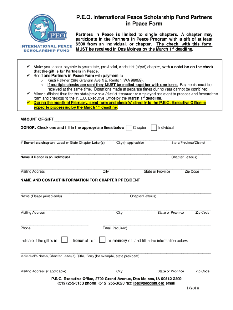 P.E.O. International Peace Scholarship Fund Partners in Peace Form Partners in Peace is limited to single chapters. A chapter may participate in the Partners in Peace Program with a gift of at least