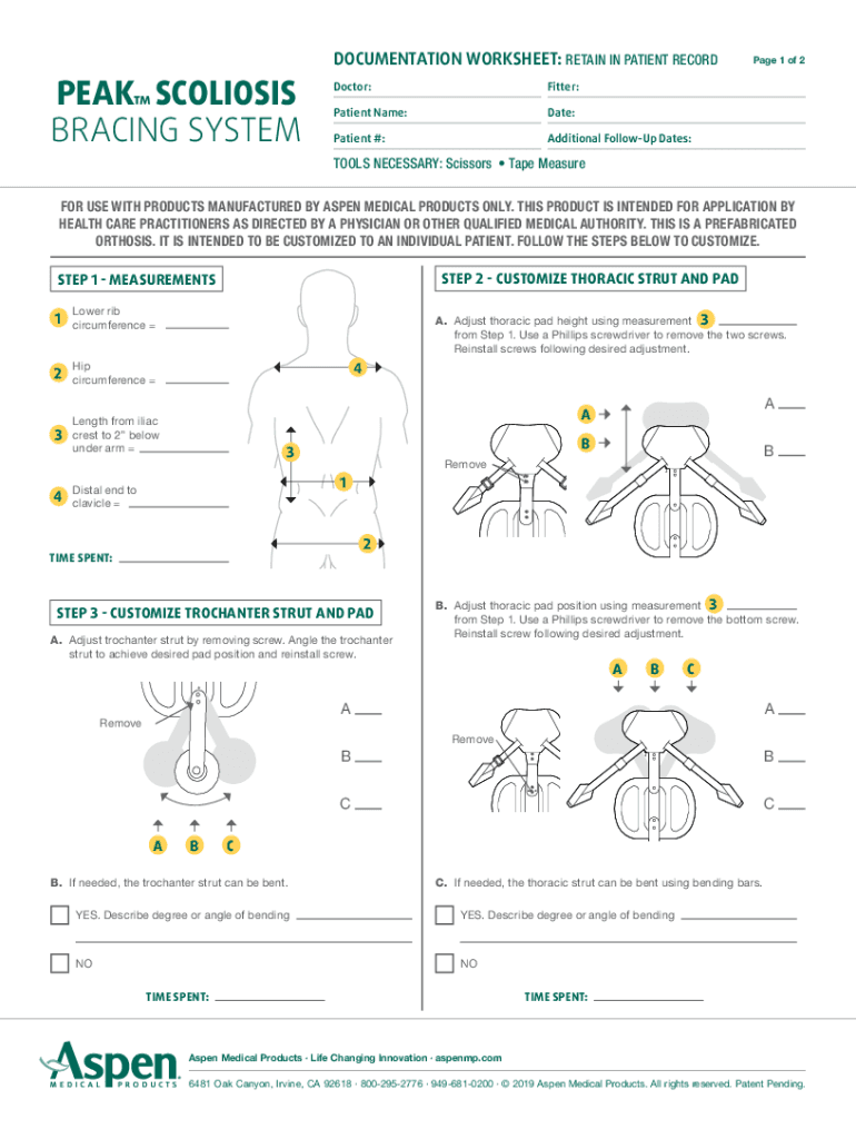 DOCUMENTATION WORKSHEET: RETAIN IN PATIENT RECORDED SCOLIOSIS BRACING SYSTEM Doctor:Fitter:Patient Name:Date:Patient #:Additional Followup Dates:Page 1 of 2TOOLS NECESSARY: Scissors Tape Measure FOR