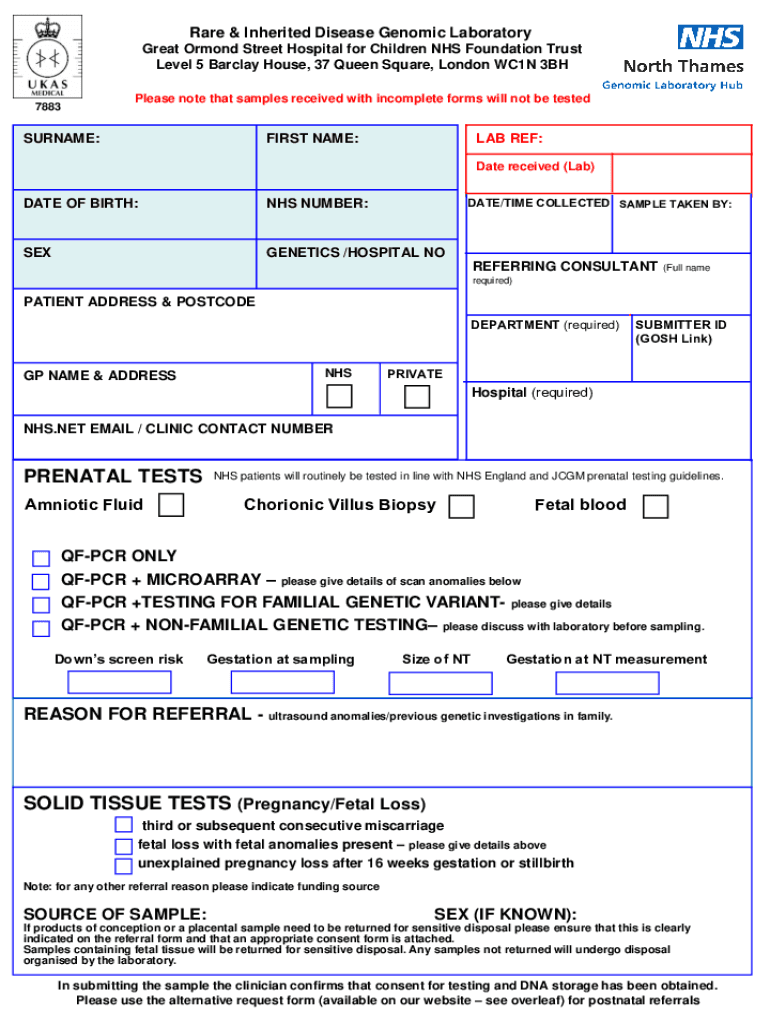 Rare & Inherited Disease Genomic Laboratory Great Ormond Street Hospital for Children NHS Foundation Trust Level 5 Barclay House, 37 Queen Square, London WC1N 3BH 7883Please note that samples received