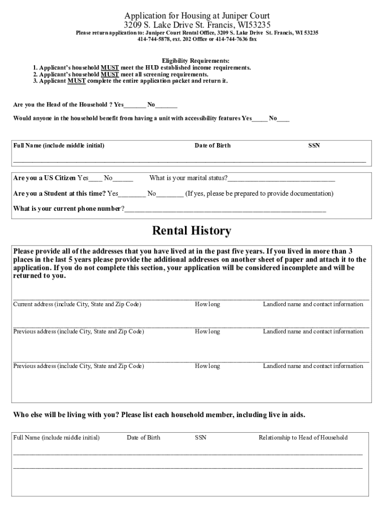 Application for Housing at Juniper Court 3209 S. Lake Drive St. Francis, WI53235Please return application to: Juniper Court Rental Office, 3209 S. Lake Drive St. Francis, WI 53235 4147445878, ext.