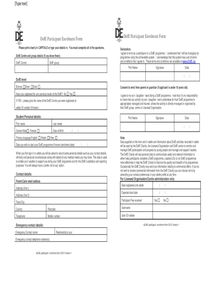 Get the free Duke of Edinburgh Enrolment Form